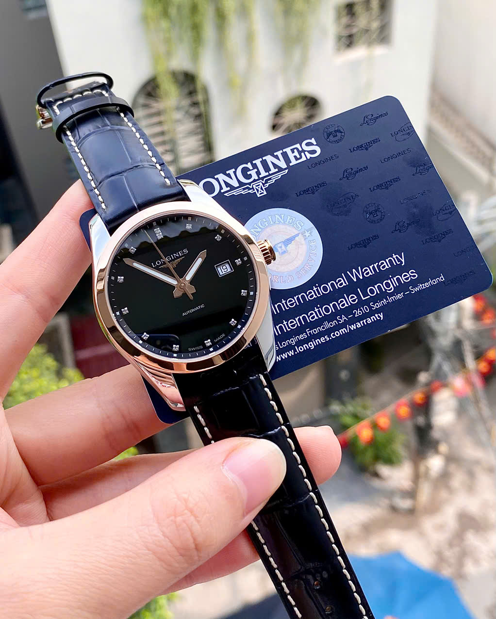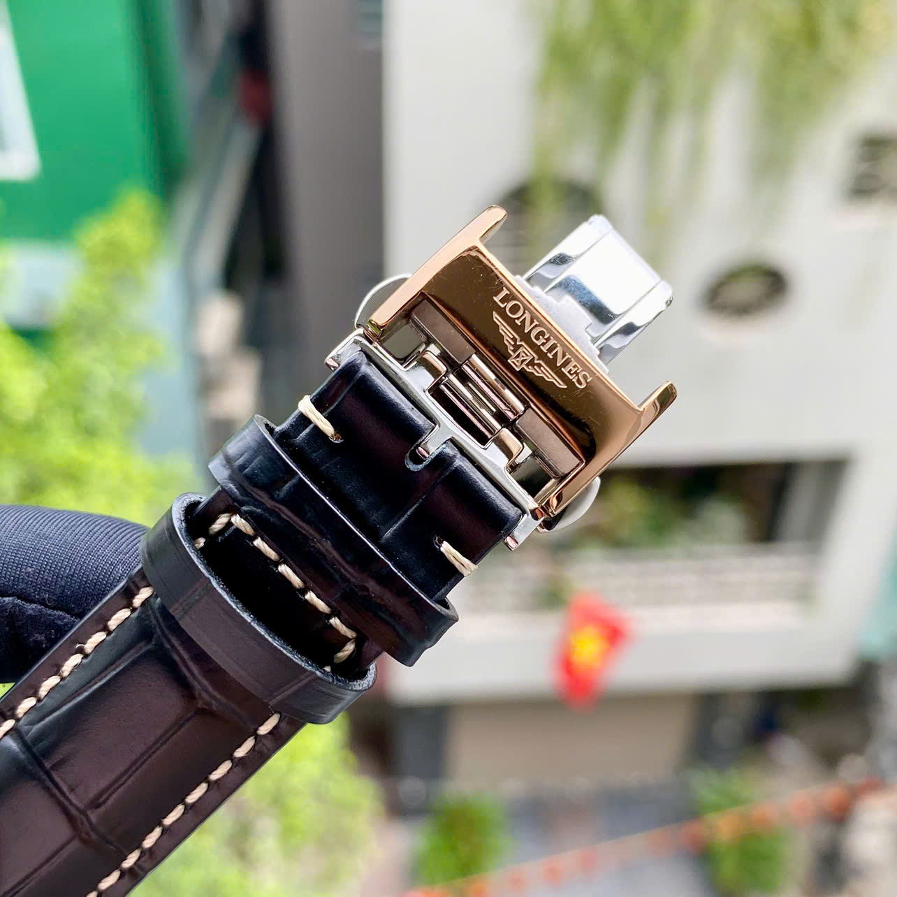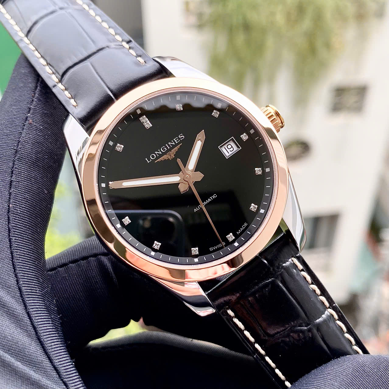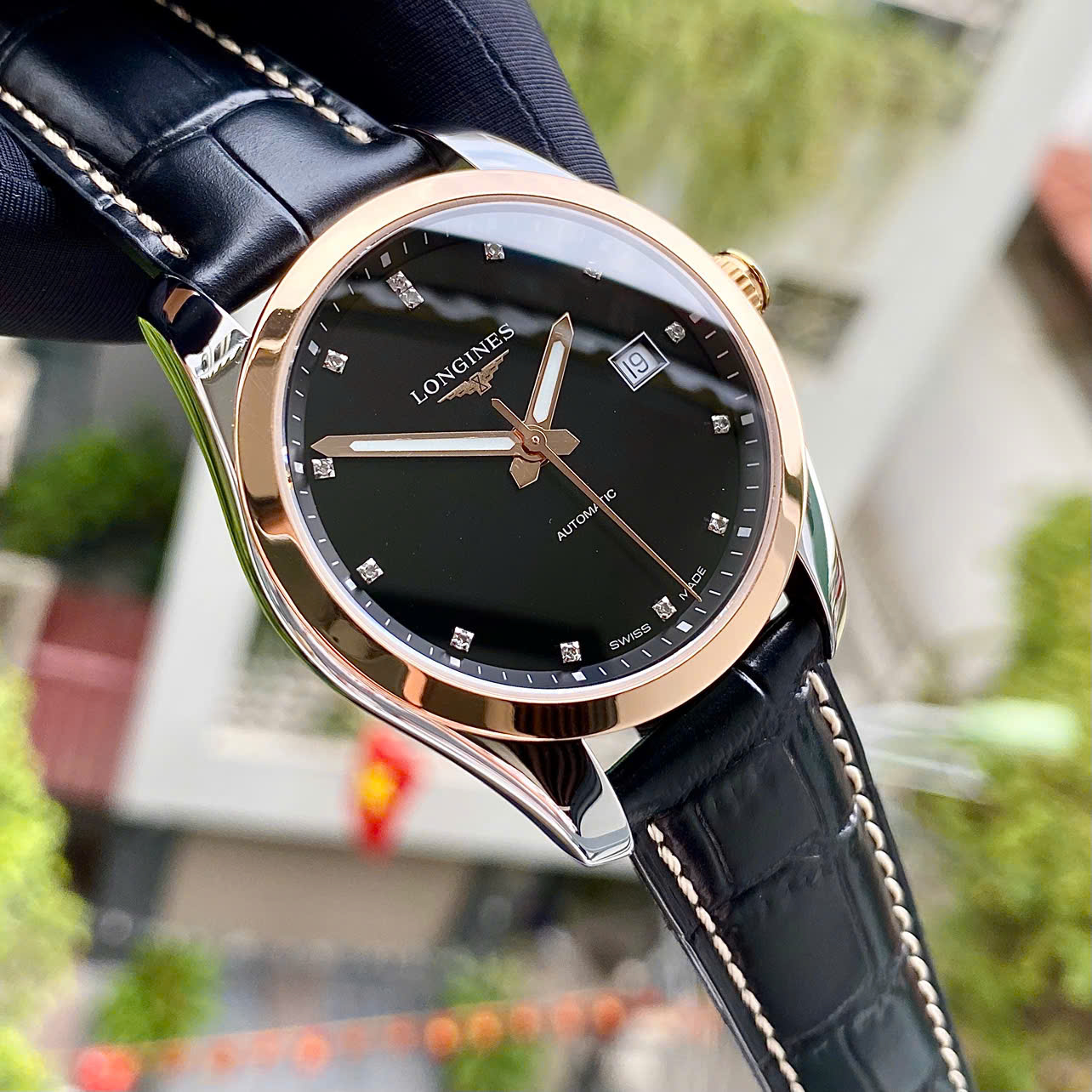 Dây đeo: Da cá sấu (Alligator) màu đen cao cấp, tạo sự đồng bộ hoàn hảo với mặt số đen. Dây da của Longines nổi tiếng với độ mềm mại và ôm tay.
