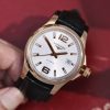 Mặt số (Dial): Màu trắng bạc với hiệu ứng tia nắng (sunray) nhẹ nhàng. Các cọc số được chải bóng sắc sảo, nổi bật nhất là con số 12 và 6 đặc trưng của dòng Conquest.
