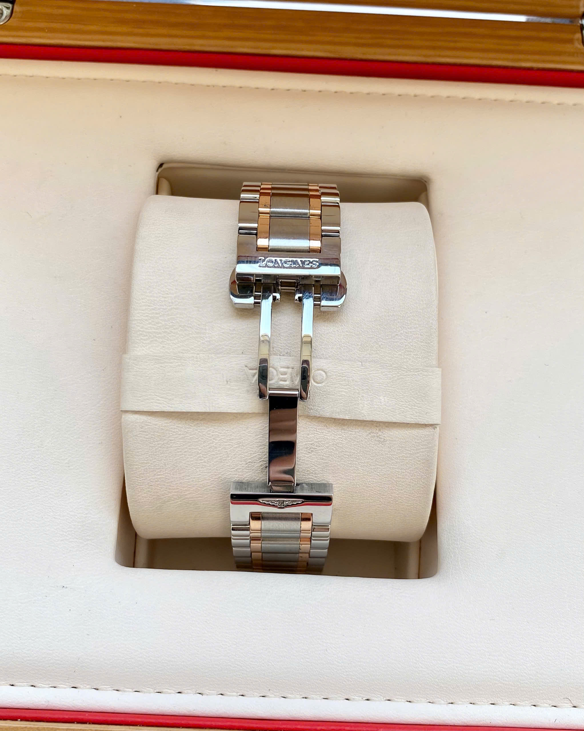 Dây đeo: Dây kim loại thiết kế 5 chỉ, với các mắt giữa được bọc vàng hồng 18K, đi kèm khóa bấm gập an toàn.