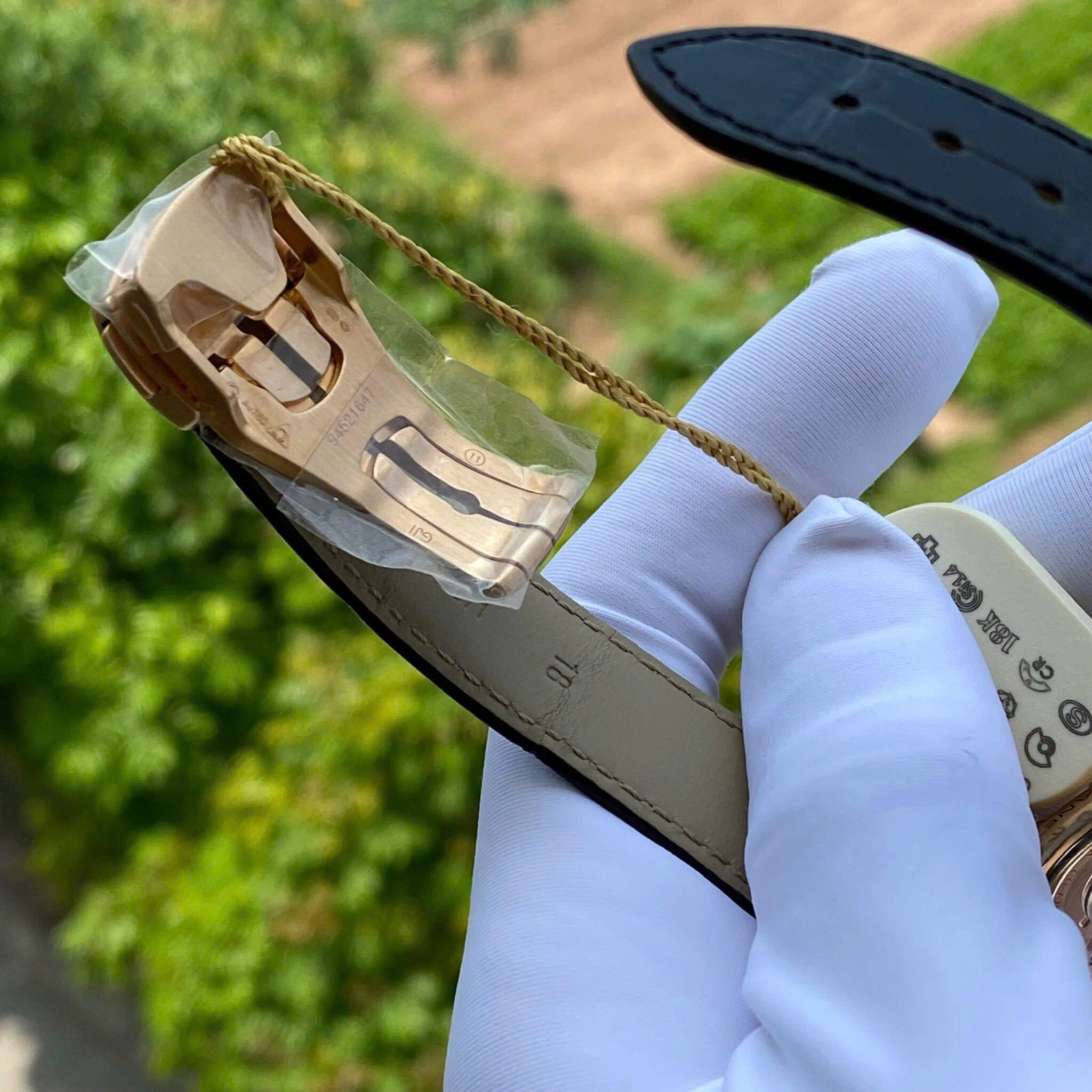 Dây đeo: Dây da cá sấu màu đen cao cấp nhưng mặt dưới lót cao su để chịu nước và mồ hôi. Đi kèm khóa gấp (Deployant clasp) bằng vàng đúc 18K.