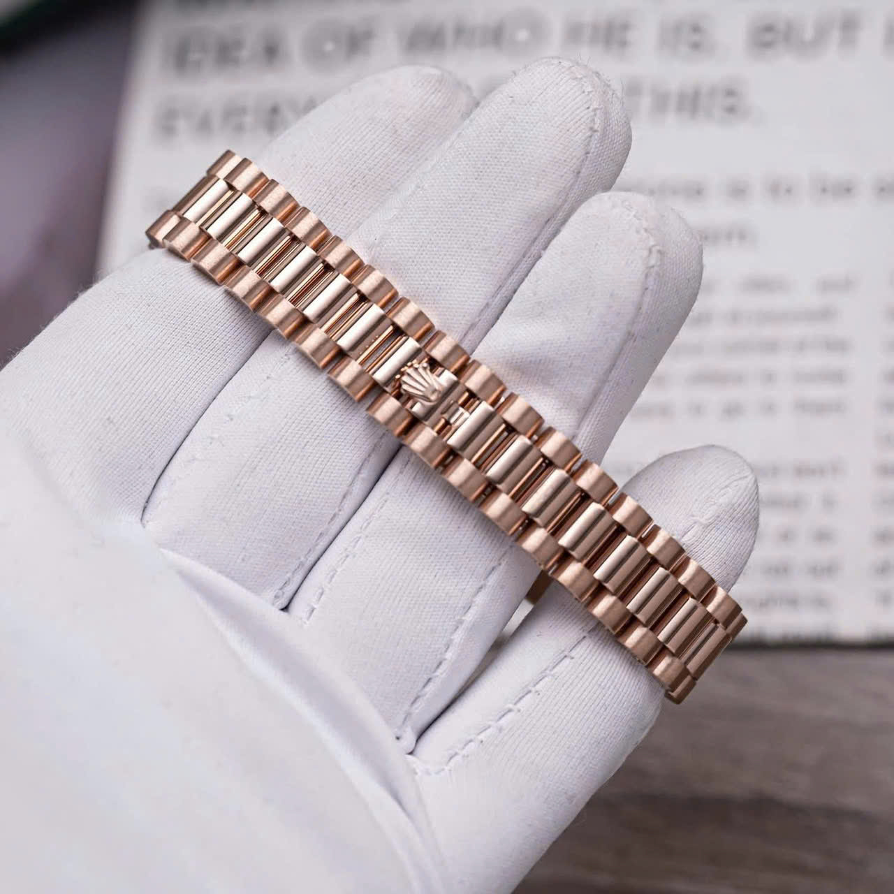 Đặc điểm: Toàn bộ vỏ và dây đeo được làm từ vàng Everose 18K độc quyền của Rolex. Đây là hợp kim vàng hồng được pha trộn thêm bạch kim để giữ cho màu sắc luôn bền đẹp, không bị phai màu hay xỉn theo thời gian.