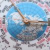 Mặt số 3 tầng: * Trung tâm: Bản đồ thế giới theo phép chiếu “Lambert” tinh xảo với các lục địa vàng hồng trên nền biển xanh/trắng.