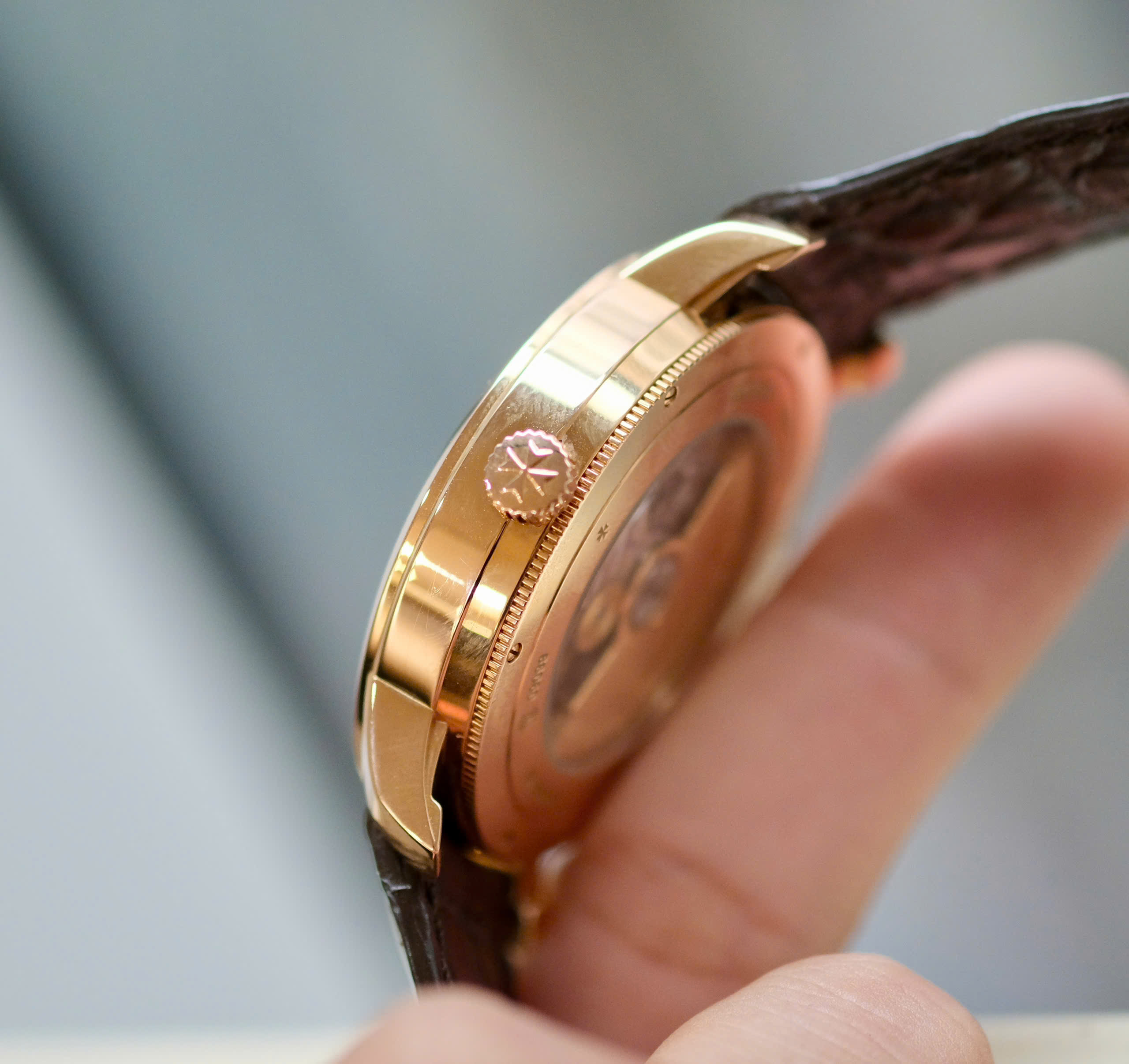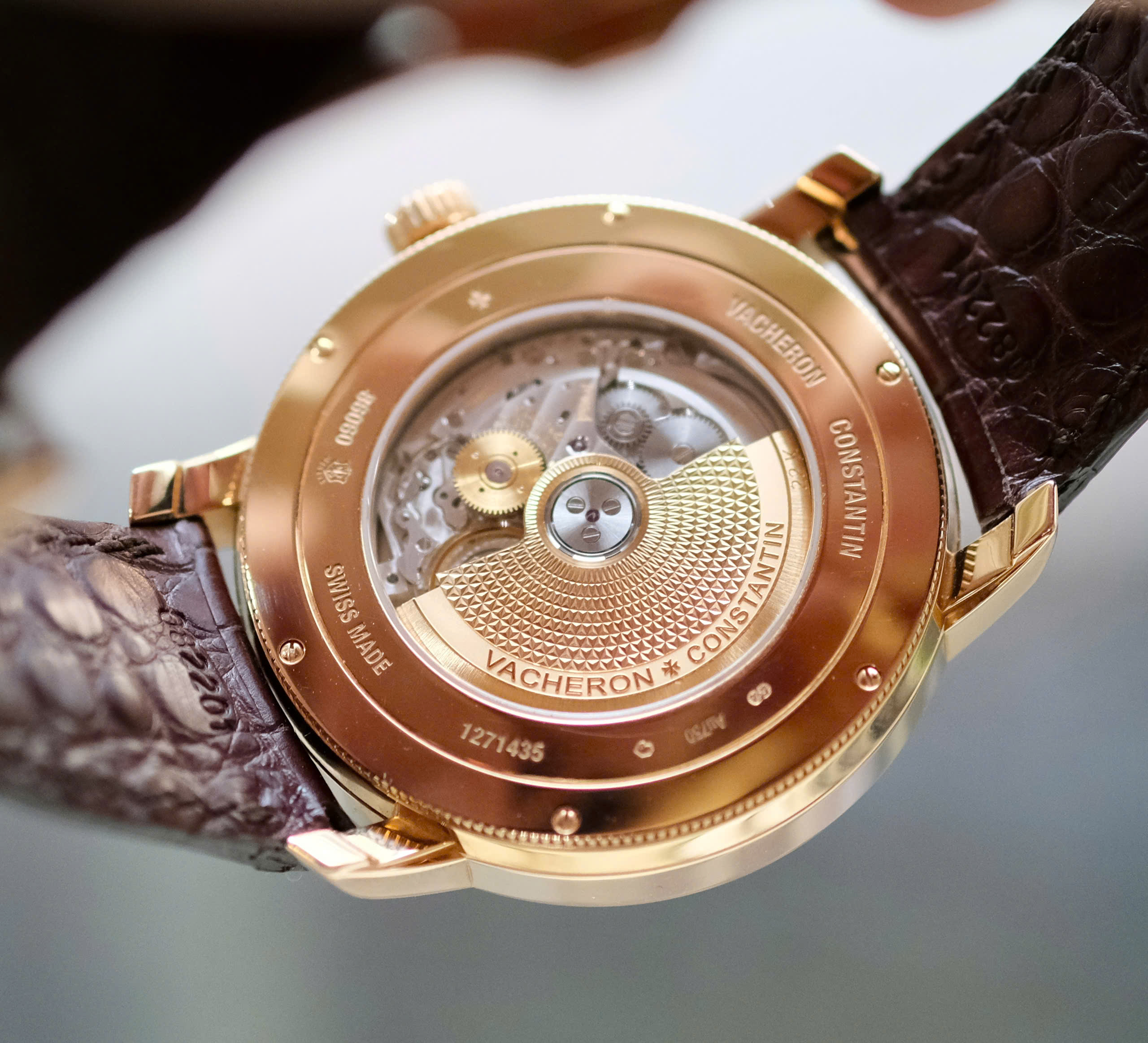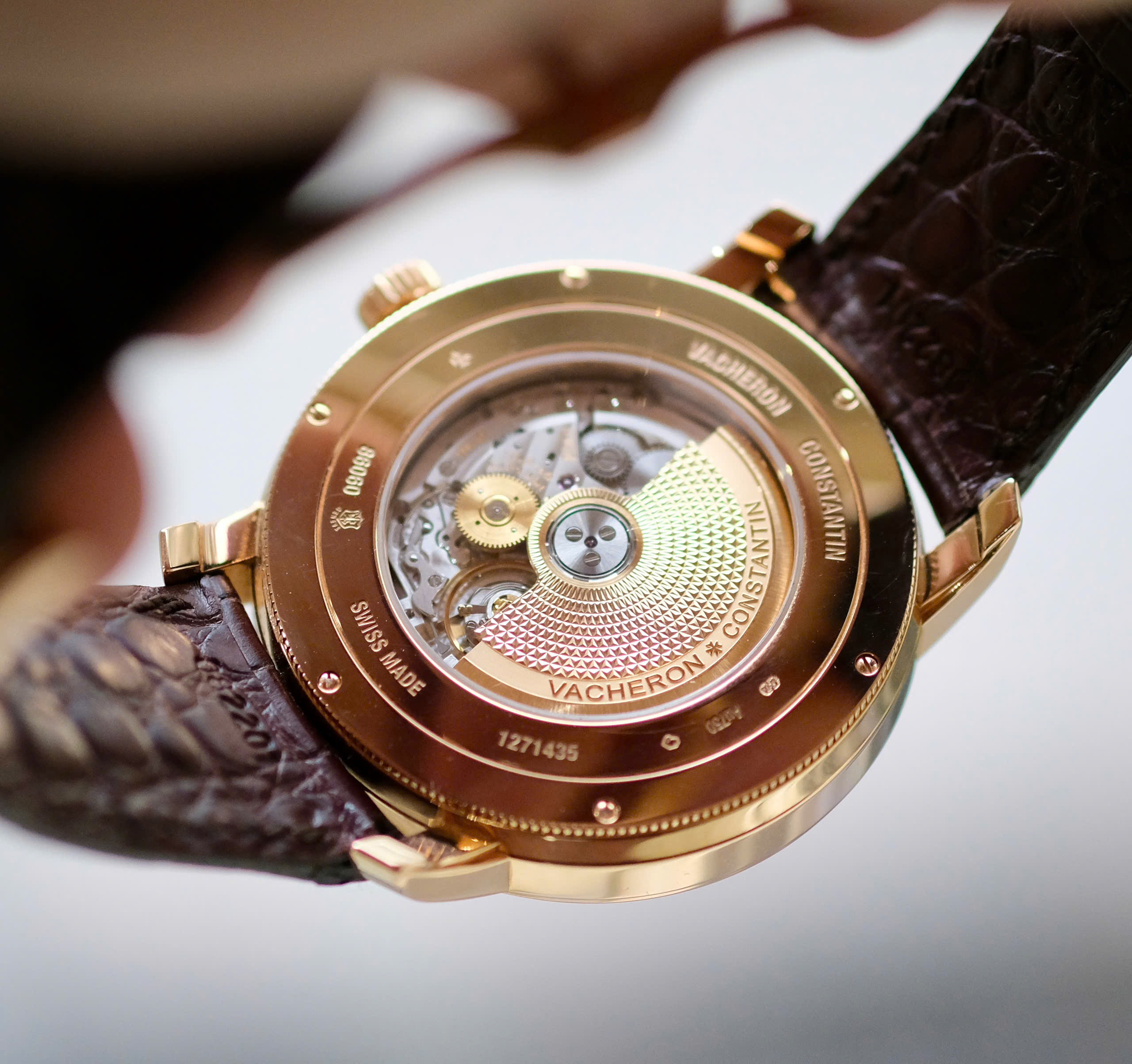Mặt sau xuyên thấu: Nắp lưng sapphire cho phép chiêm ngưỡng rotor bằng vàng 22K được chạm khắc họa tiết Guilloché cực kỳ tỉ mỉ.