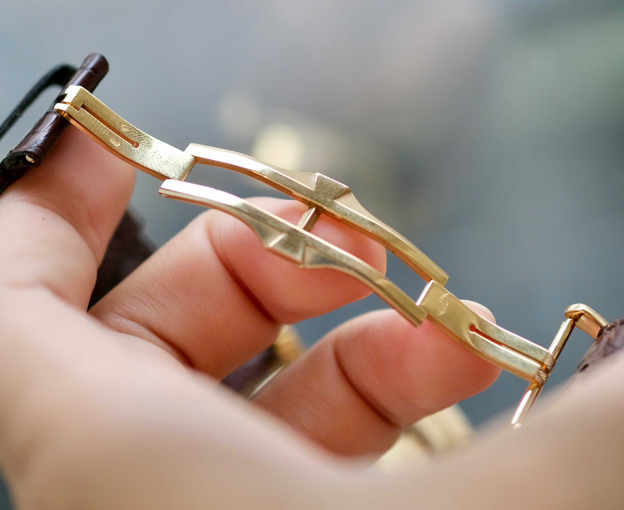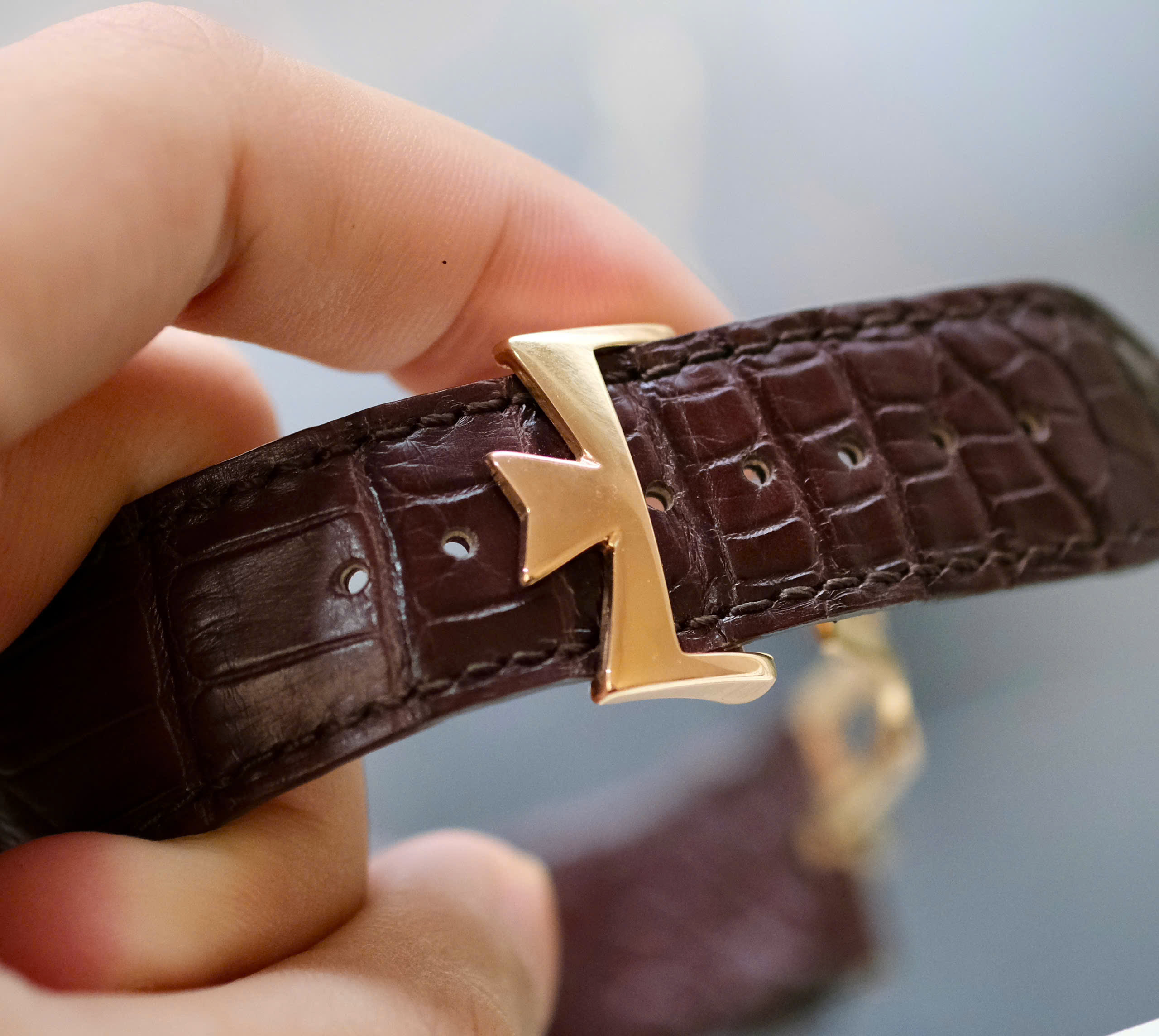 | Dây đeo | Da cá sấu Mississippiensis màu nâu, khóa gập vàng hồng hình biểu tượng chữ thập Maltese |